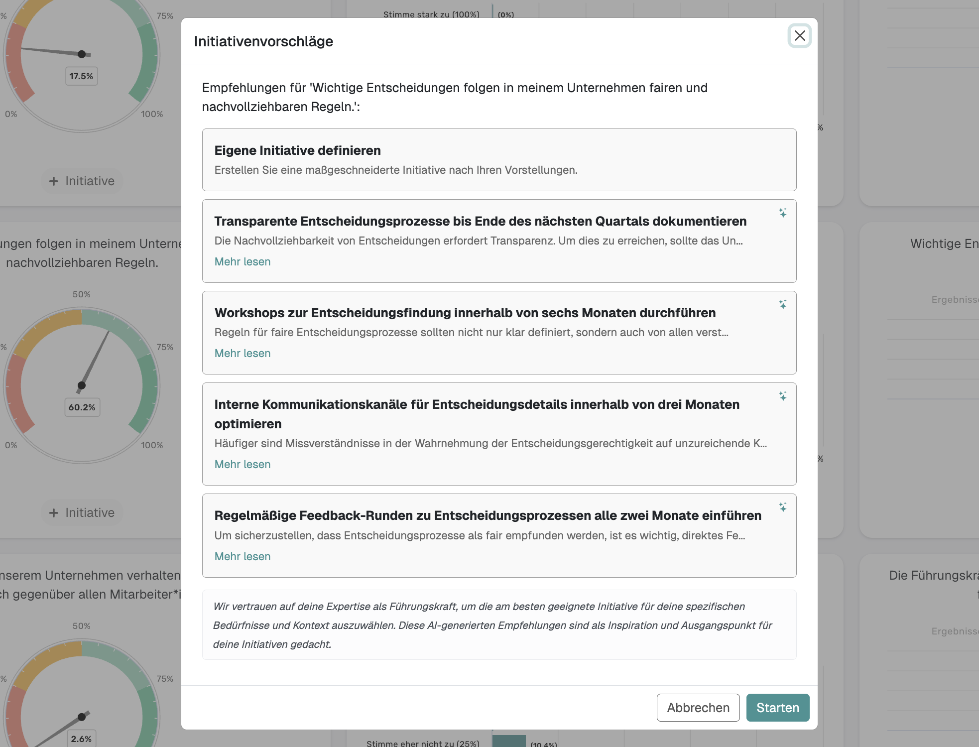Verknüpfen Sie Initiativen direkt mit einer konkreten Umfrage und Frage, um Ihre Umsetzung nachvollziehbar zu machen und ihren Impact zu messen.