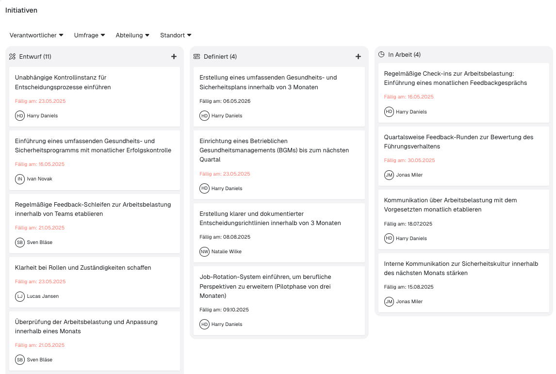 Nach einer Befragung ist es oft eine Herausforderung, die Erkenntnisse in eine nachhaltige Veränderung zu überführen. Das Initiativen-Modul bietet hier die notwendige Unterstützung und Struktur, um diese Prozesse effizient zu begleiten und Veränderungen anzustoßen. Ein absoluter Mehrwert, um den Wandel greifbar und erfolgreich zu machen.