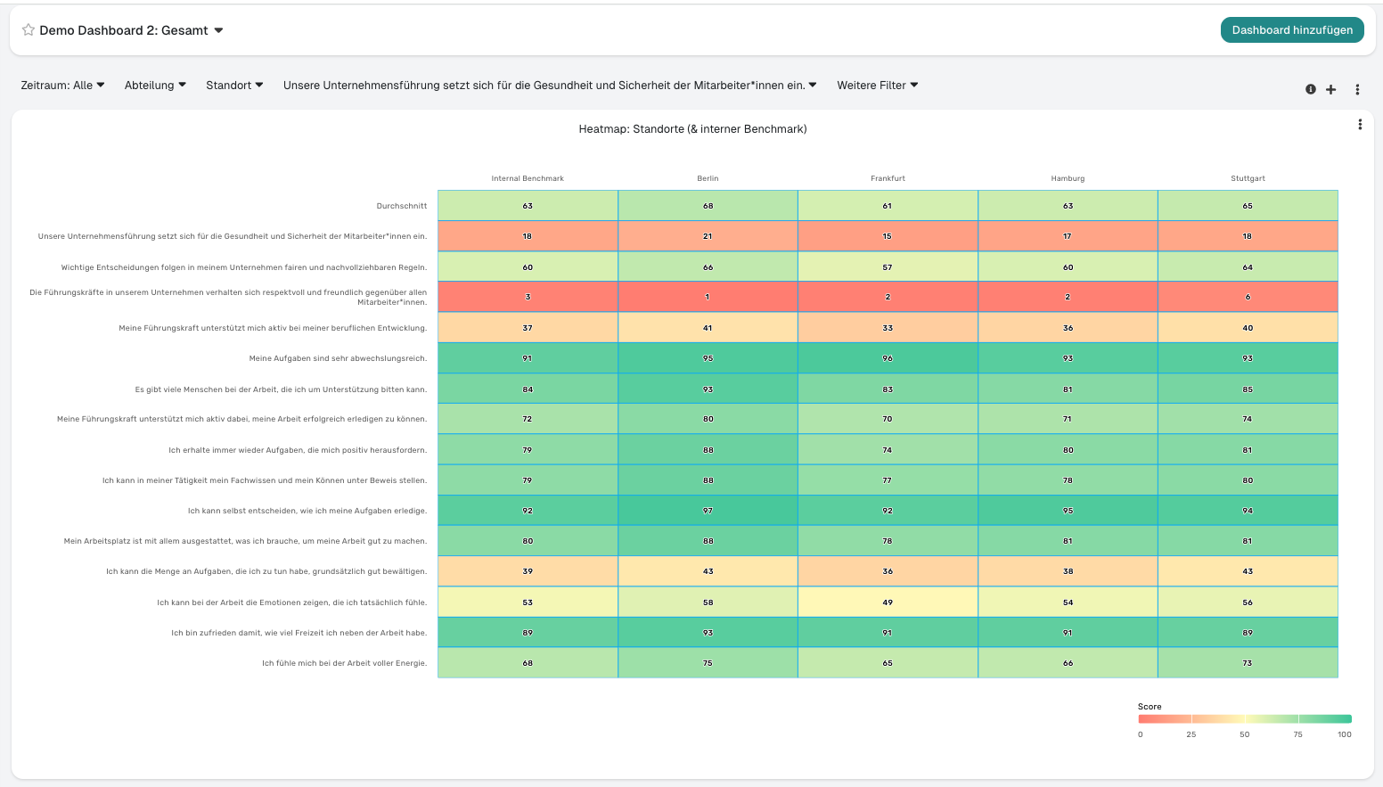 Erstellen Sie automatisch Dashboards aus jeder Befragung - individuell anpassbar mit unterschiedlichen Diagrammtypen. Gruppieren Sie Inhalte nach Themen und gewinnen Sie neue Perspektiven durch gezielte Filter wie Standort oder Geschlecht.