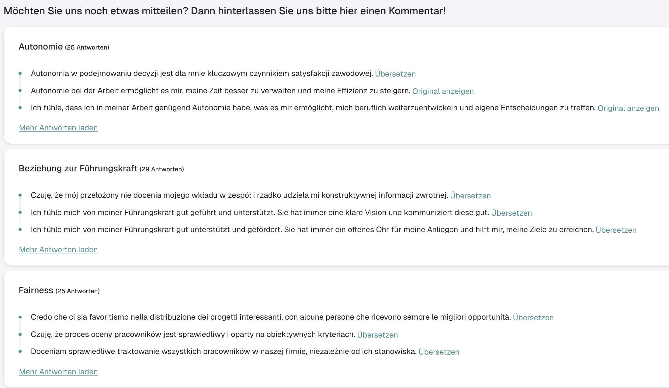Unsere Topics AI kategorisiert und fasst die Antworten für Sie zusammen – auch mehrsprachig