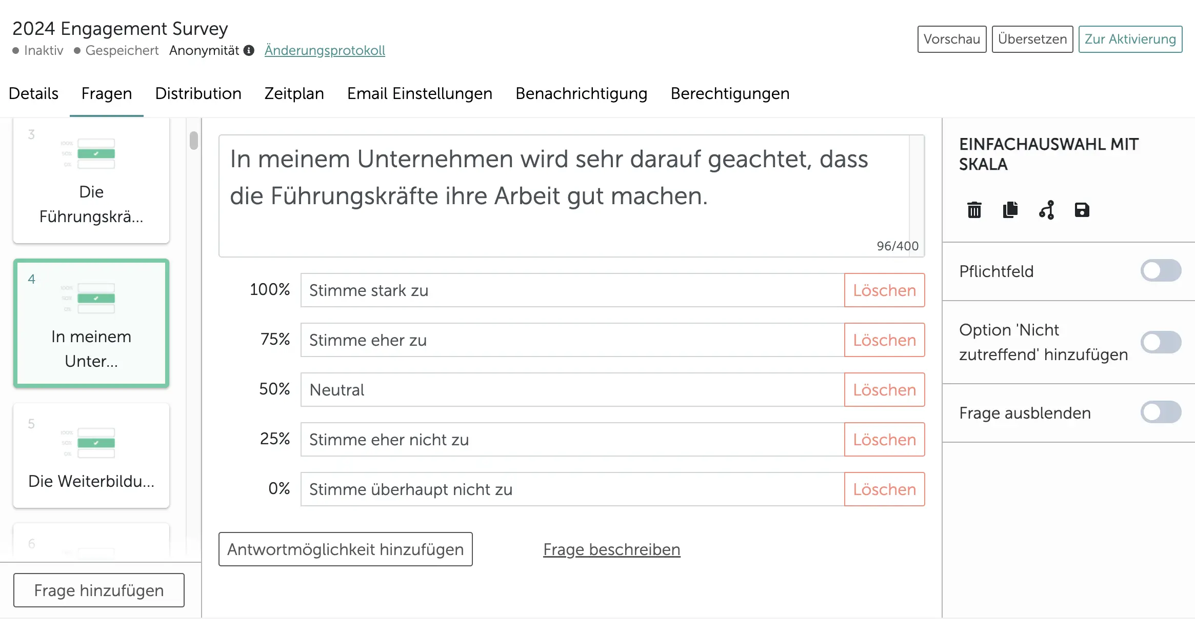 Die Befragten können angeben, wie stark sie den einzelnen Aussagen zustimmen, wodurch ein klares quantitatives Bild der Ansichten zu einem bestimmten Thema der Mitarbeiterbefragung entsteht.