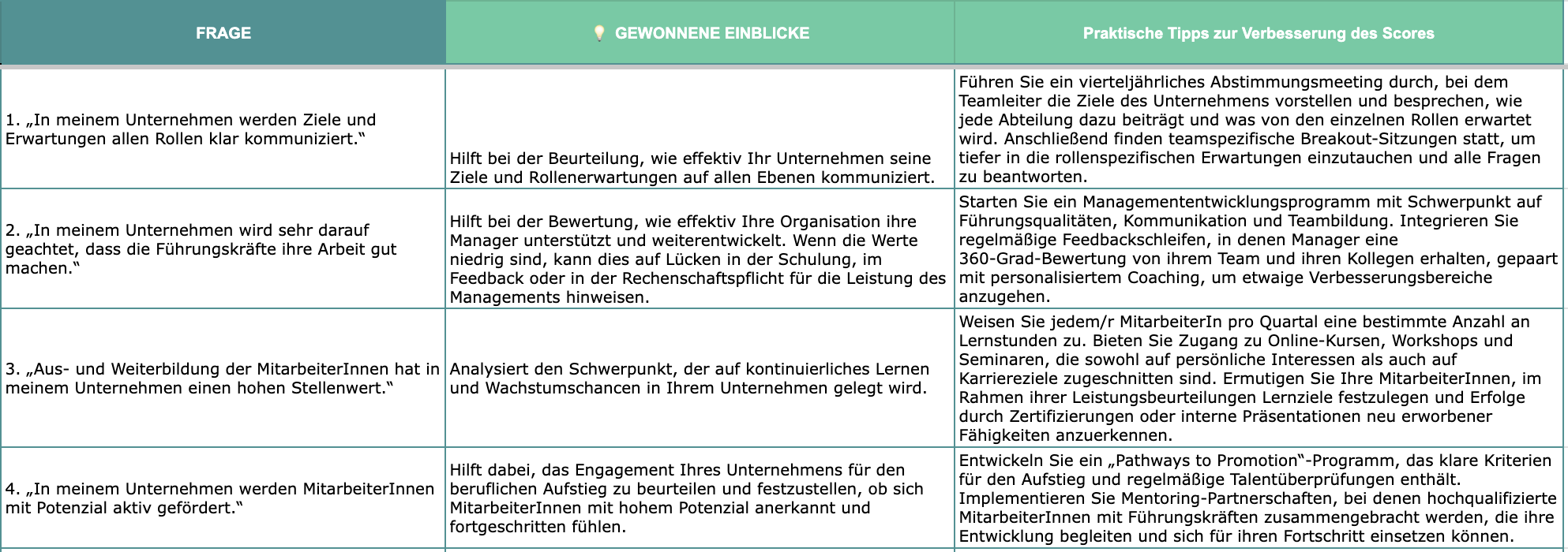 💡 Einblicke: Hilft bei der Beurteilung, wie effektiv Ihr Unternehmen seine Ziele und Rollenerwartungen auf allen Ebenen kommuniziert.